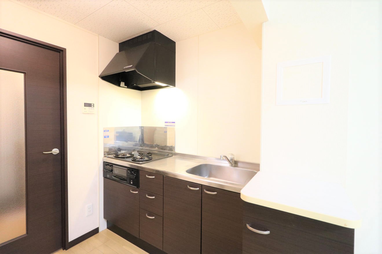 『キッチン』3口ガスコンロ+グリル付システムキッチンを完備